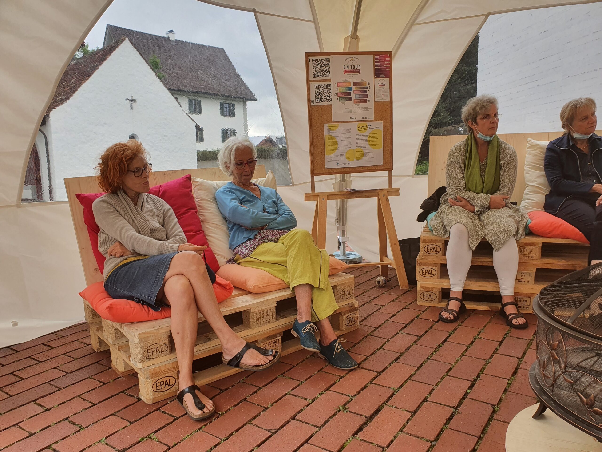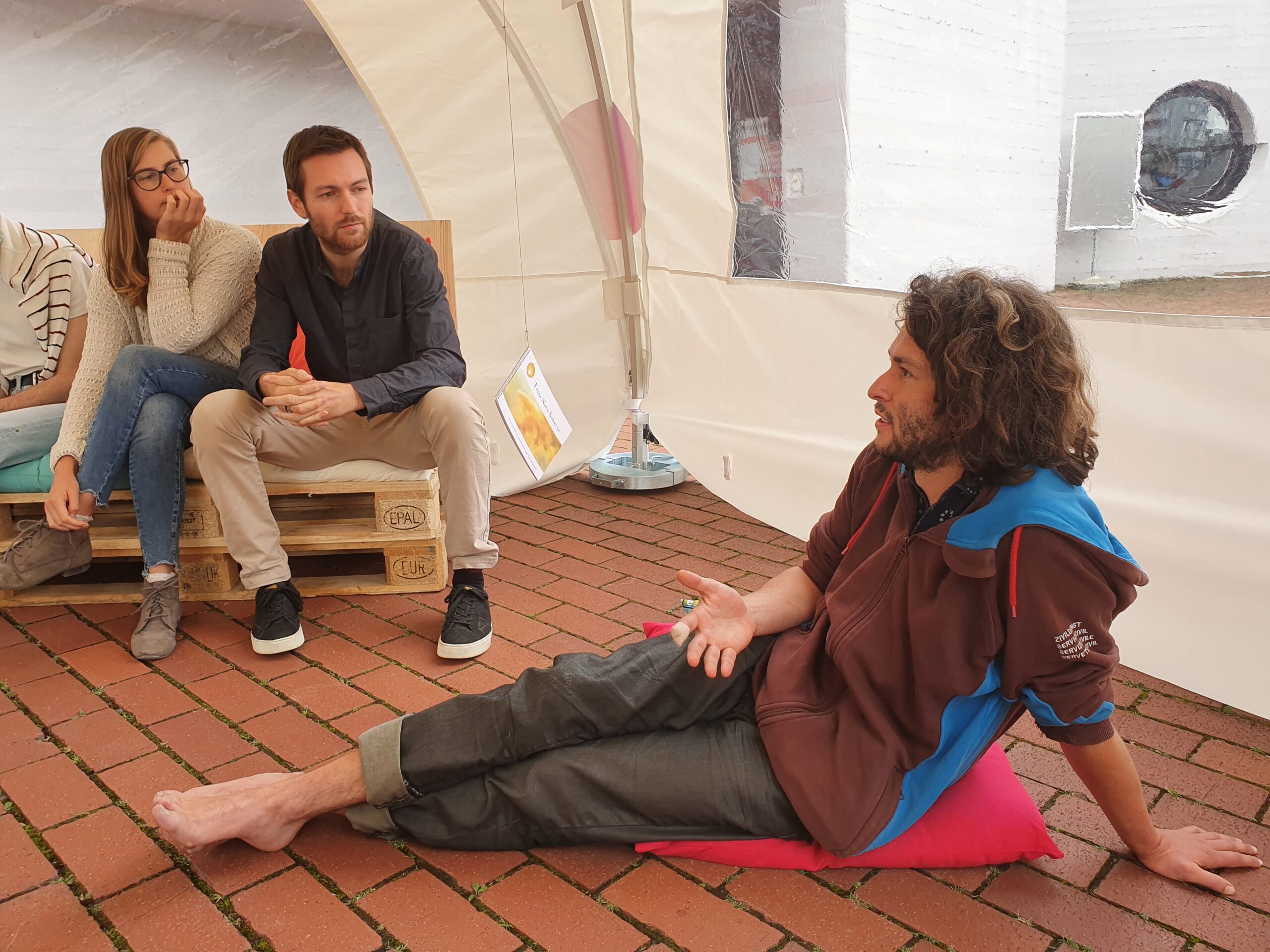 Lernen: Was können Kirchen gut, was können andere besser? Regula Grünenfelder stellte eine «Lebendige Bibliothek» mit Persönlichkeiten anderer Weltanschauungen zusammen, die sich als «Lebendige Bücher» dem kommunikativen Austausch mit den Camp-Teilnehmenden stellten. Dies waren unter anderem drei Vertreter*Innen der Brahma Kumaris-Bewegung (Ursula Breuss, Mathias Steffen, Anna Ziegler). Brahma Kumaris (die «Töchter Brahmas») ist eine religiös-spirituellen Gemeinschaft aus Indien mit mehreren hunderttausend Mitgliedern, die auch in Zürich eine «Aussenstation» hat. Gelehrt wird Raja Yoga, die liebevolle Verbindung zwischen Mensch und Gott. Weitere «Lebendige Bücher» (Lisa Breithut, Simon-Domique Wäckerlin) entstammten einer therapeutischen Wohn- und Lebensgemeinschaft in Degersheim, die sich als Teil der Gemeinschaft Terra Nova Schweiz verstehen und ein Modell für nachhaltiges, friedliches und liebevolles Leben auf der Erde aufbauen wollen.[1] Auch ein Vertreter der Klimabewegung stellte sich «Lebendiges Buch zur Verfügung, der Klima- und Medienaktivist Jann Kessler (climastrike.ch) sowie Chantal Studer vom Verein fra-z, einem beweglichen Frauen*zentrum in der Zentralschweiz, das dem Kirchen-Camp ihr Zelt zur Verfügung stellte. fra-z bietet einen «Raum für Frauen* von A-Z, die eine gute und gerechte Welt zur Sprache bringen und realisieren wollen. fra-z ist offen für Frauen aller Weltanschauungen, Kulturen, Generationen und Lebensentwürfe (fra-z.ch).