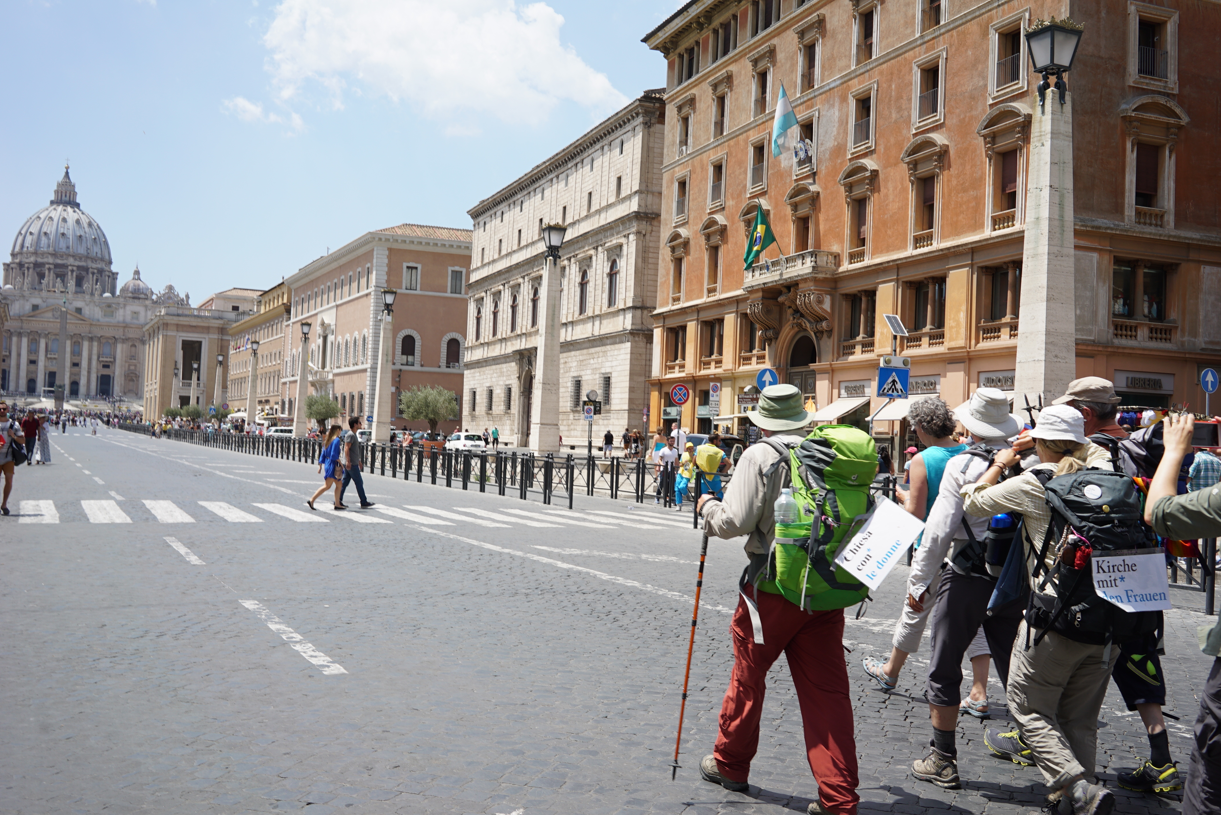 So weit gut und schön. Ich ziehe ein ganz anderes Fazit. Der Vatikan hat die pilgernden Frauen auflaufen lassen. Niemand ist ihnen aus der Burg entgegengelaufen. Die Frauen waren am 2.Juli in Rom. Weder der Papst noch irgendeine wichtige Persönlichkeit wie zum Beispiel der Kardinalstaatssekretär, empfing die Frauen. Hildegard Aepli meint dazu: „Insgesamt wurden zwei Briefe verschickt. Einer ging direkt an die Adresse der Heiligen Vaters und einer über den Nuntius. Wir haben konkret um eine Audienz oder eine Eucharistiefeier mit dem Papst angefragt. Zur Antwort bekamen wir, dass der Papst am 2. Juli Ferien habe. Inzwischen haben wir allerdings erfahren, dass er sich am Samstag mit der neuen römischen Bürgermeisterin getroffen haben soll und erst am kommenden Donnerstag in die Ferien fährt. Ich gehe davon aus, dass er gar nichts von uns weiss.“ Das ist Kommunikationsverweigerung! Nehmen wir wahr, was hier geschieht: